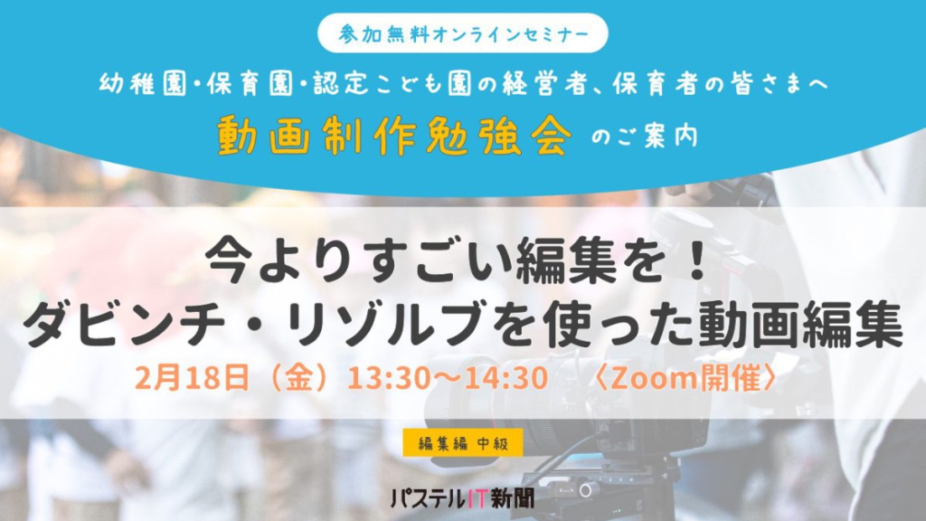 【終了】2月18日(金)開催!園のための動画制作勉強会 編集編中級『今よりすごい編集を!「ダビンチ・リゾルブ」を使った動画編集』