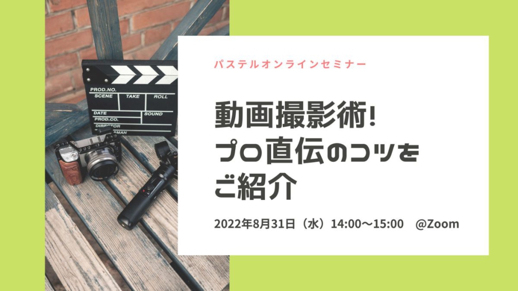 開催概要 動画撮影術!プロ直伝のコツをご紹介 – 動画撮影術!プロ直伝のコツをご紹介 –カメラワーク・構図・目的にあわせた撮影方法など、動画撮影のテクニックをプロの映像クリエイターがご紹介します! ■日程 2022年8月31日(水)14:00~15:00 〈Zoom... -